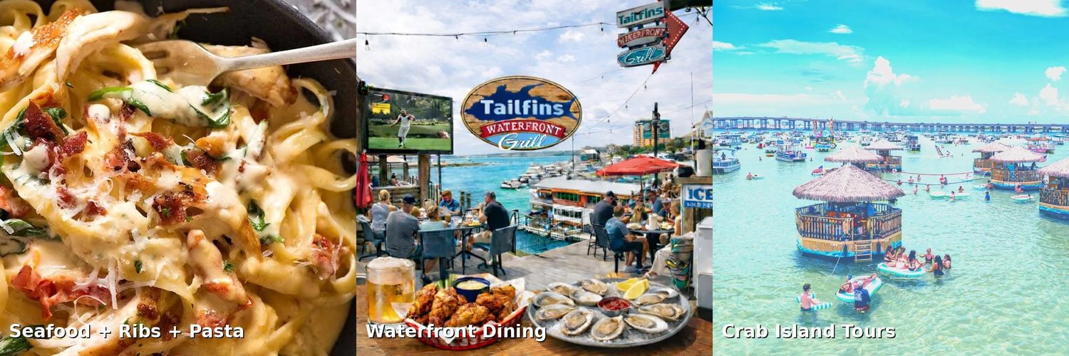 Located on the Destin Harbor Boardwalk, we’re the perfect stop before your next adventure. Tailfins, offering waterfront breakfast, lunch, and dinner on the Destin Harbor. Plus, you are steps from a boat rental to get to the famous Crab Island.